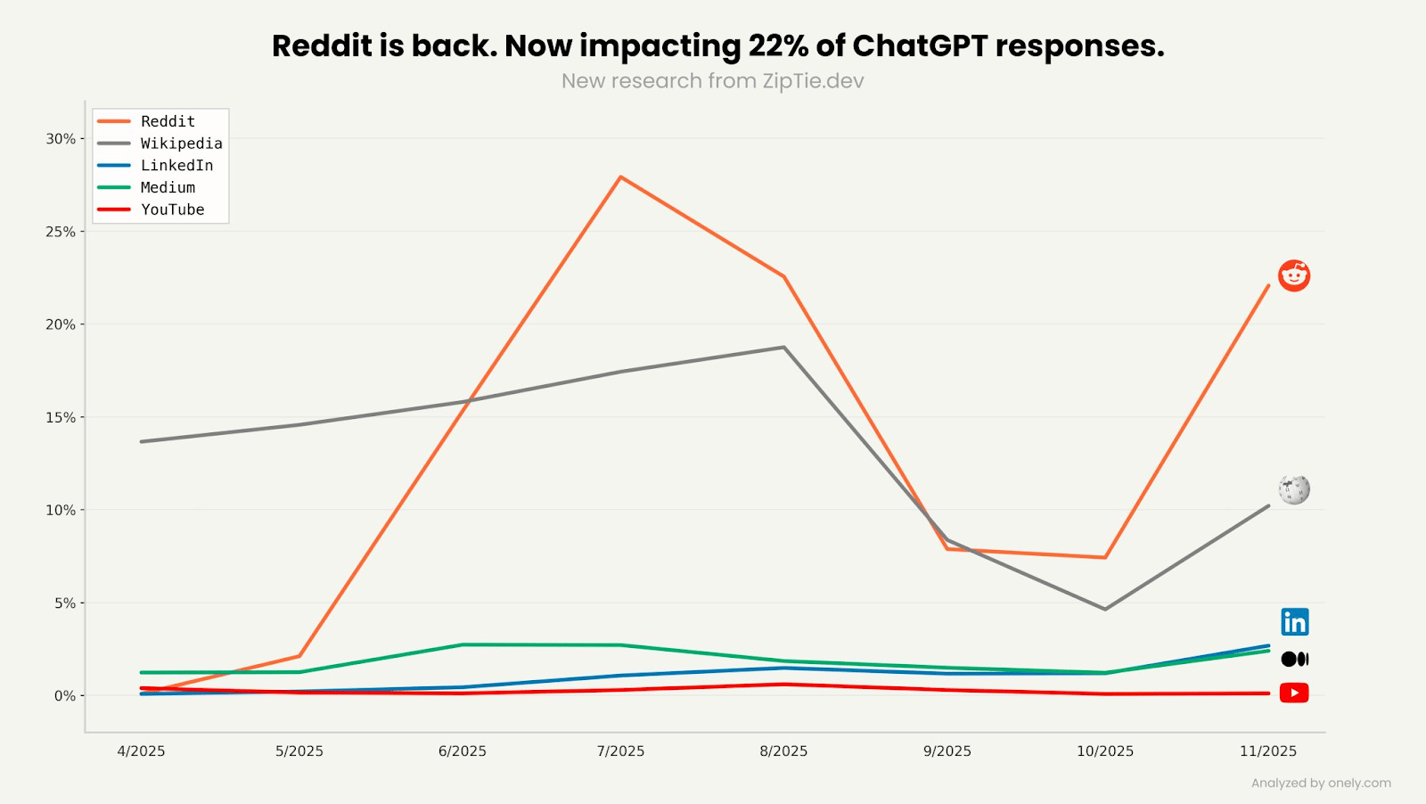 In fact, just on the LLM front, Ziptie ran a study showing Reddit is impacting 22% of ChatGPT responses.