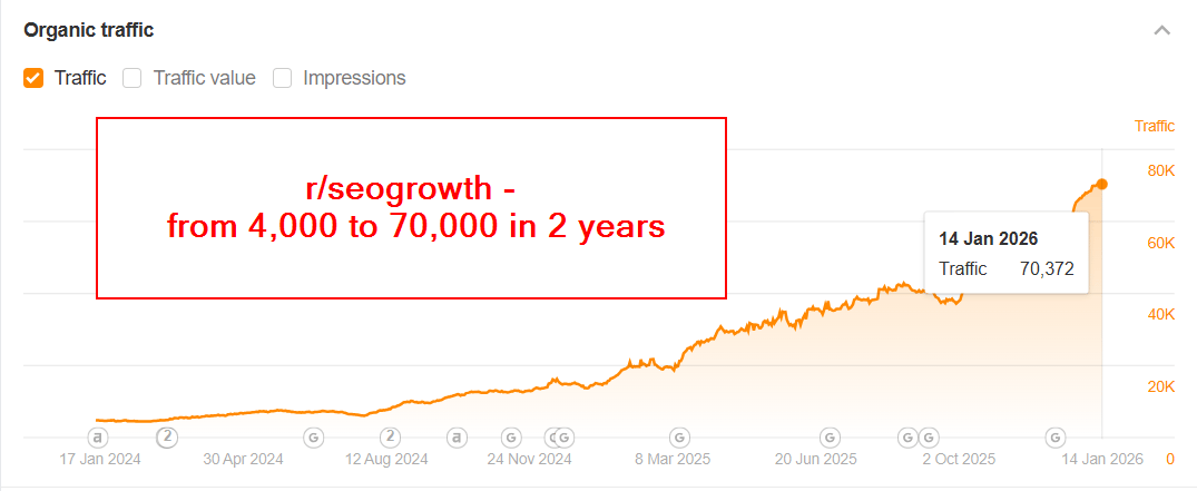r/seogrowth is an example of a subreddit which an SEO agency made, and is now getting over 70,000 estimated visitors a month, just from the organic search presence.