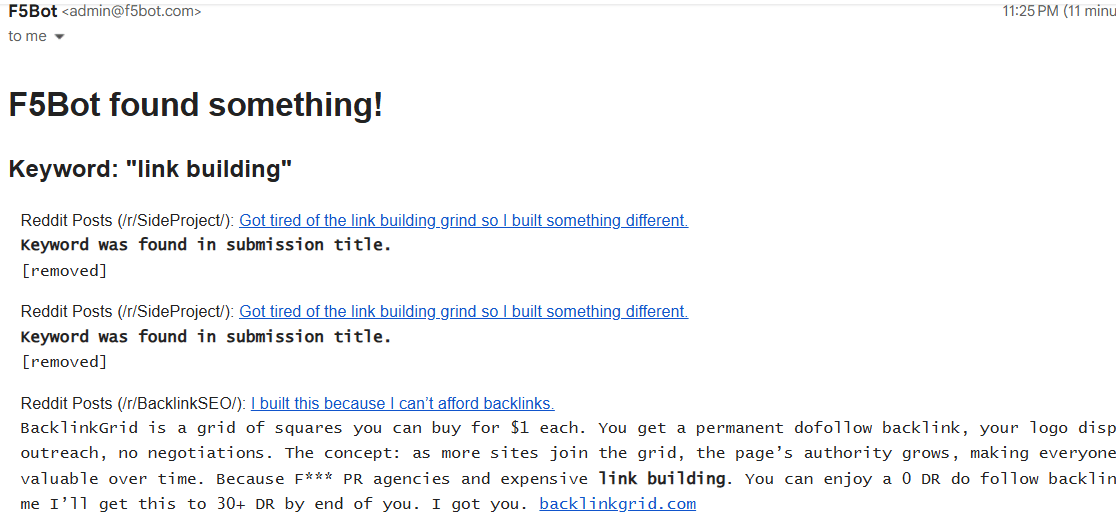 You plug in keywords and get notified when relevant threads or comments appear (example email below)
